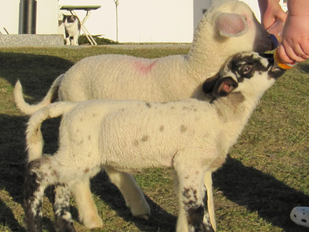 Insider wissen es ja schon: wir haben jetzt auch Schafe. Besser gesagt: zwei Lämmer. Louise und Heinrich. Die beiden hätten beim Schäfer keine Überlebenschance gehabt und werden hier am Quellenhof mit der Flasche großgezogen. Heute haben die beiden einen Ausflug ins Grüne gemacht: