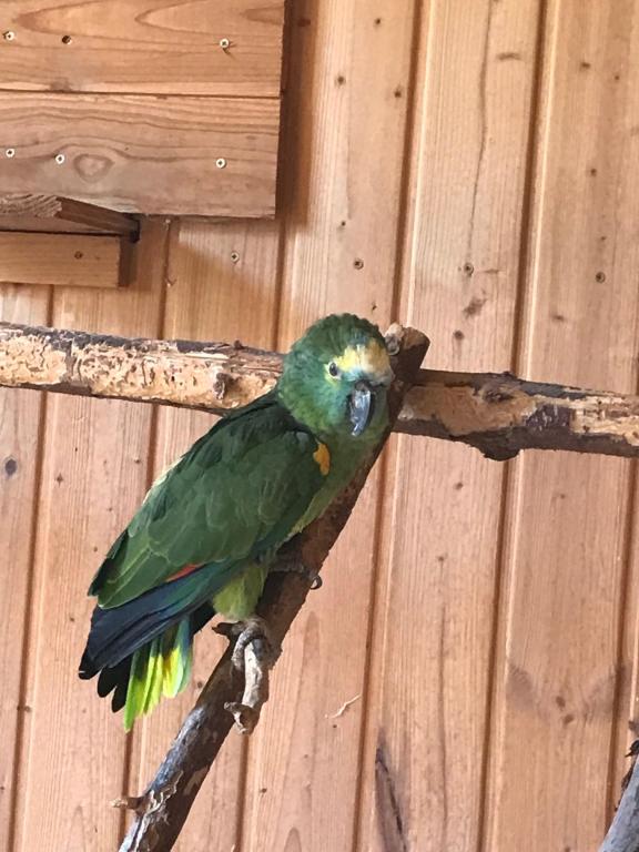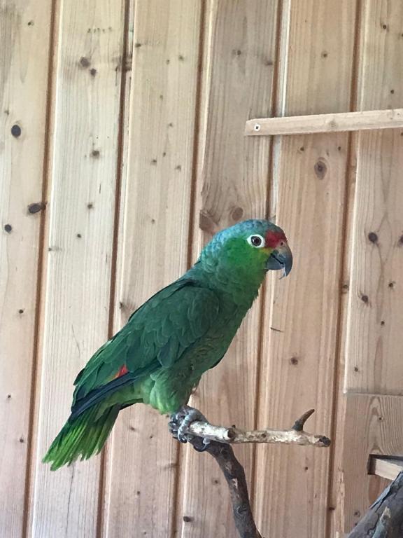 Blaustirnamazone Moni kann nicht fliegen, hüpft aber auf den Ästen umher. Sie kann sprechen. Sie ist schon immer etwas klein im Wuchs.