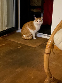 Dieser rot-weiße Kater streunt schon seit 2024 am Sebastianiplatz umher. Er ist sehr scheu, man kann ihn nicht anfassen, aber er ist nicht bösartig oder aggressiv. Er versteht sich auch mit den bereits vorhandenen Katzen der Finderin.