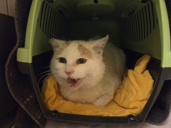 Der unkastrierte, weiß-rote Kater nistete sich seit Ende Dezember 2022 in einem Hackschnitzelbunker ein und konnte von der Finderin jetzt erst gesichert werden, weil er anfangs sehr scheu war.