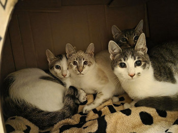 Im August sind in Simbach, Schlehenweg 4 Katzenbabys ohne Mutter gefunden worden. Sie wurden bis jetzt vom Finder betreut, der sie aber nicht vermitteln konnte und sie auch nicht länger behalten kann. Woher sie kamen und was mit der Mutter passiert ist, ist nicht bekannt. Sie sind jetzt 5-6 Monate alt und gerade im Zahnwechsel. Es sind drei kleine Kater und eine Katze, die lieb und nicht scheu und in einem guten Allgemeinzustand sind.