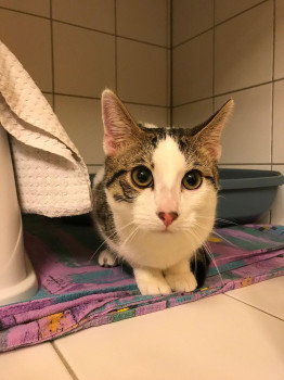 Er wurde dem Tierarzt vorgestellt, der ihn auf ca. 6 Monate schätzt. Er ist nicht kastriert, auch nicht gechippt oder anderweitig gekennzeichnet. Er hatte einige Flöhe und ist leicht untergewichtig. Seine Ohren wurden schon einmal behandelt, also muss er jemandem gehören oder sich jemand um ihn gekümmert haben.
