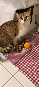 Diese scheue Katze ist am 22.09.2025 plötzlich bei den Findern in Pilsting/Harburg aufgetaucht. In der gesamte Nachbarschaft ist sie nicht bekannt. Sie ist ziemlich ängstlich. An der rechten Vorderpfote hat sie eine wahrscheinlich schon ältere, nicht behandelte Verletzung, die deshalb eventuell falsch zusammengewachsen ist.