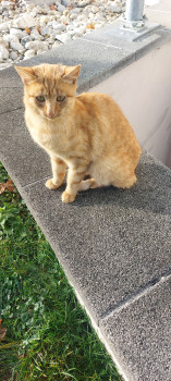 Er wurde dem Tierarzt vorgestellt, der ihn auf ca. 6 Monate schätzt. Er ist nicht kastriert, auch nicht gechippt oder anderweitig gekennzeichnet. Er hatte einige Flöhe und ist leicht untergewichtig. Seine Ohren wurden schon einmal behandelt, also muss er jemandem gehören oder sich jemand um ihn gekümmert haben.