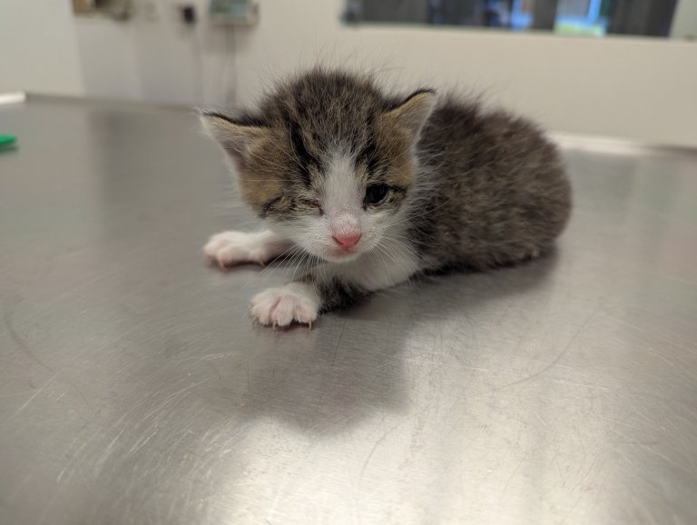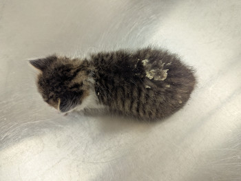 Auf der Straße zwischen Simbach und Haunersdorf, Höhe Niederlehen, wurde dieses etwa 3-4 Wochen alte Katzenbaby gefunden. Es hat nicht nur Katzenschnupfen und eitrige Augen, sondern ist auch voller Flöhe und Fliegenmaden.Die Finder brachten den kleinen Kater ins Tierheim.