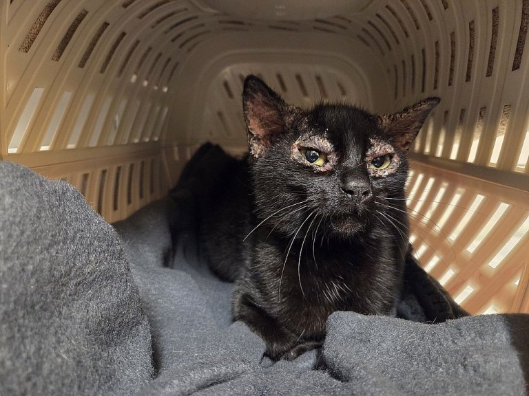 Die Katze hat Hautprobleme und starke Verkrustungen um beide Augen und Ohren.
