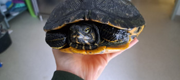 In Wallersdorf-Haidlfing, Mittlere Bachstraße, wurde am 07.07.25 abends diese Gelbwangenschmuckschildkröte gefunden. Sie wurde von der Polizei Landau ins Tierheim gebracht.
