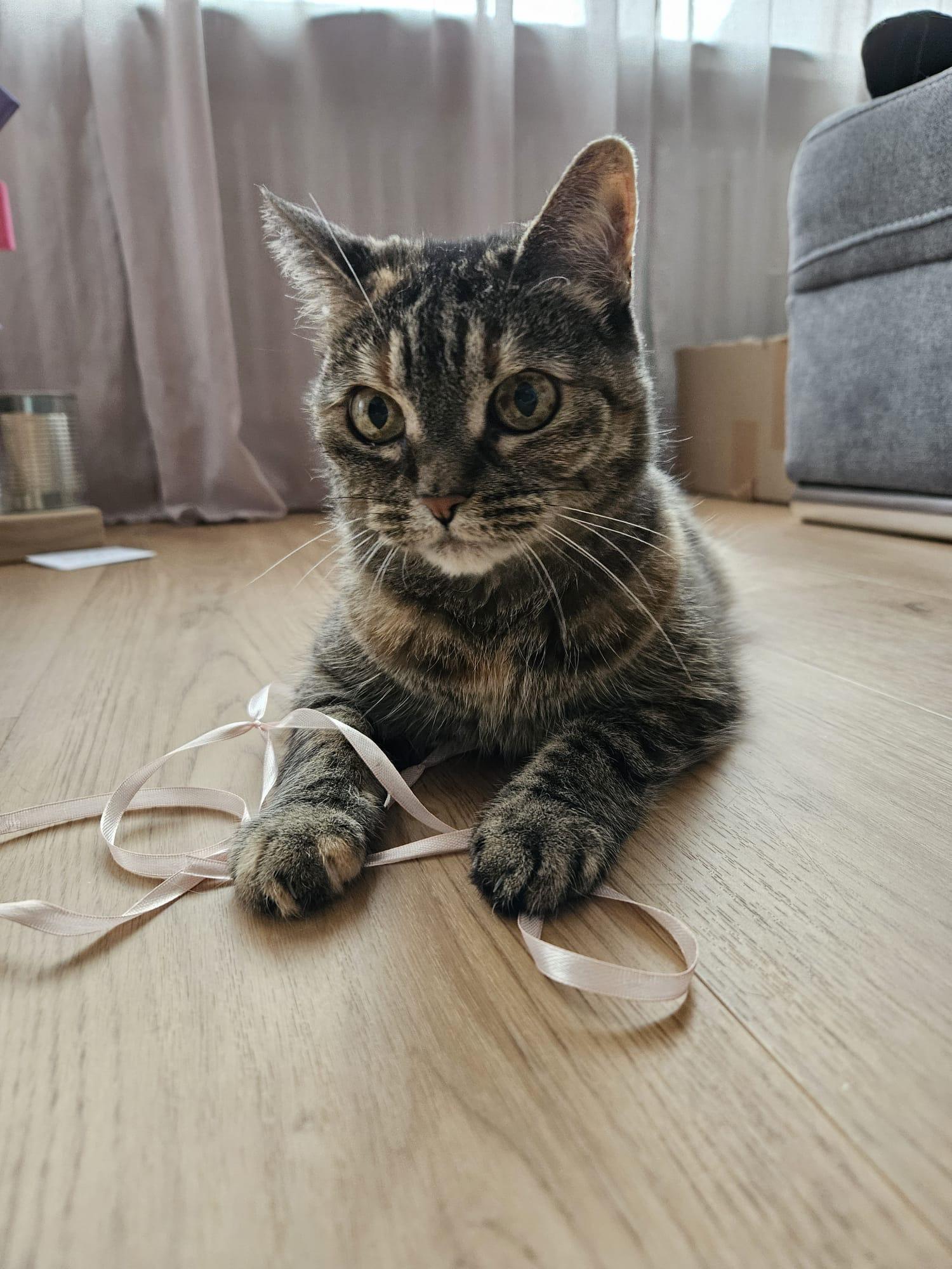 Grüne Augen. Klein und schlank. Bunt Getigert. Getchipt und sterilisiert. Zutraulich aber nicht verschmust. Wirft sich auf denn Boden um gestreichelt zu werden, will aber nicht getragen werden.