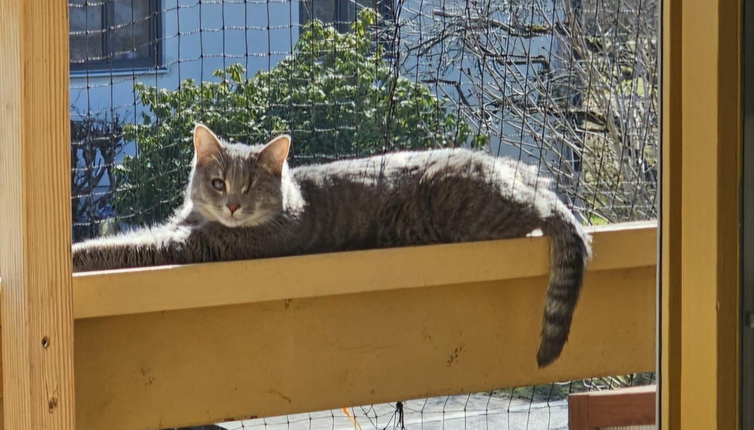 Besondere Kennzeichen: Er ist grau-schwarz getigert, ist aber unterhalb des Kinn weiß. Er ist 1,5 Jahre alt und kastriert.