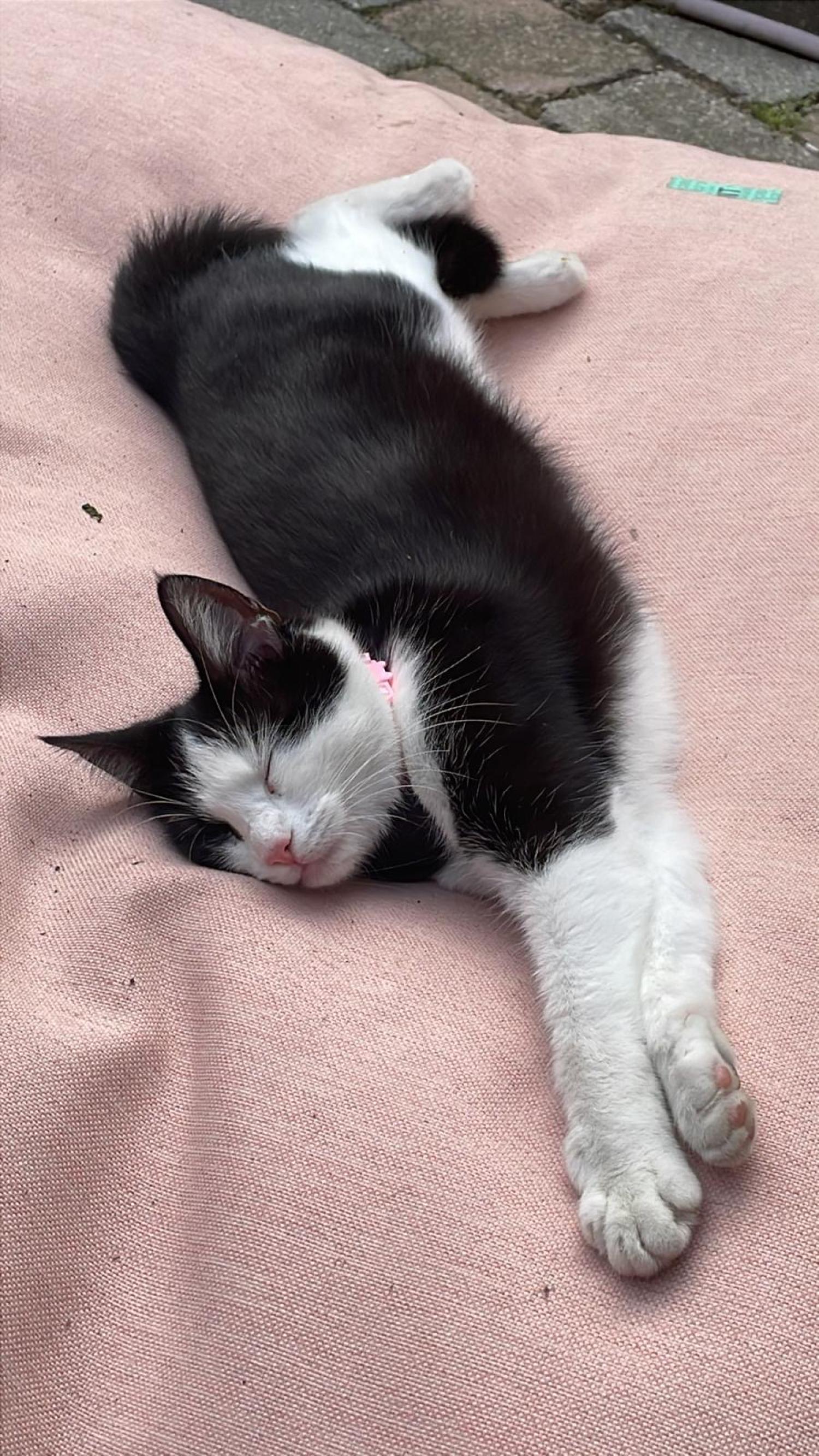 Schwammerl ist grau getigert, prinzipiell zutraulich und gechipt. Sie kann mit dem grauen Auge sehr eingeschränkt sehen (hell/dunkel, Gegenstände die in der Nähe sind). Aufgrund dieser Einschränkung mag sie auch keine lauten Geräusche und fürchtet sich dann schnell.