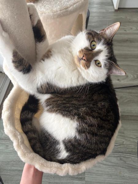 Mein Kater ist eher kleiner als ausgewachsene Katzen, er ist bisschen weiß, weiße Pfoten. Bisschen über 1 Jahr ist er. Hört auf Pfeifen. Normalerweise eher zutraulich.