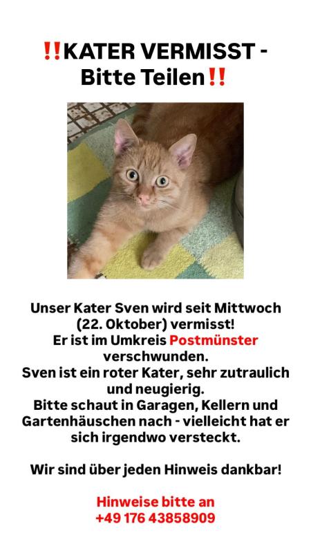 Seit Mittwoch, 22.10.25 vermissen wir unsere dreibeinige, rot-weiße Katze (weiblich). Das rechte Hinterbein ist amputiert ( bereits verheilt). Bitte melden Sie Sichtungen oder falls Sie wissen, bei wem sie ist, an das Tierheim oder bei meiner Anzeige auf Kleinanzeigen.de. Danke