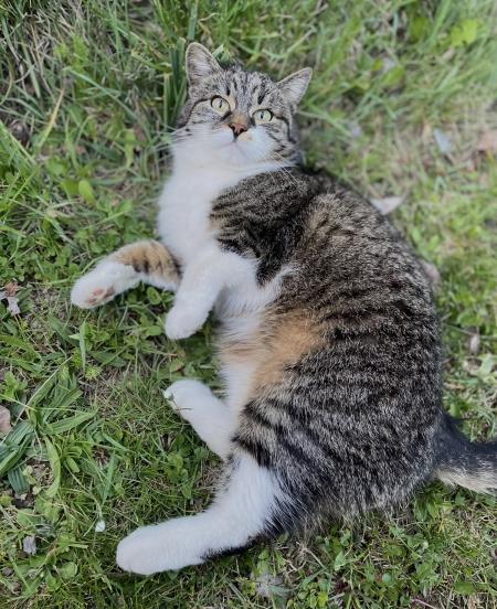 Unser Fünferl ist grau/braun/schwarz getigert, nicht gechipt, ca. 1,5 Jahre alt, schmale Statur und sehr zutraulich. Hört auch auf seinen Namen und lässt sich mit dem Rascheln einer Leckerlitüte locken.