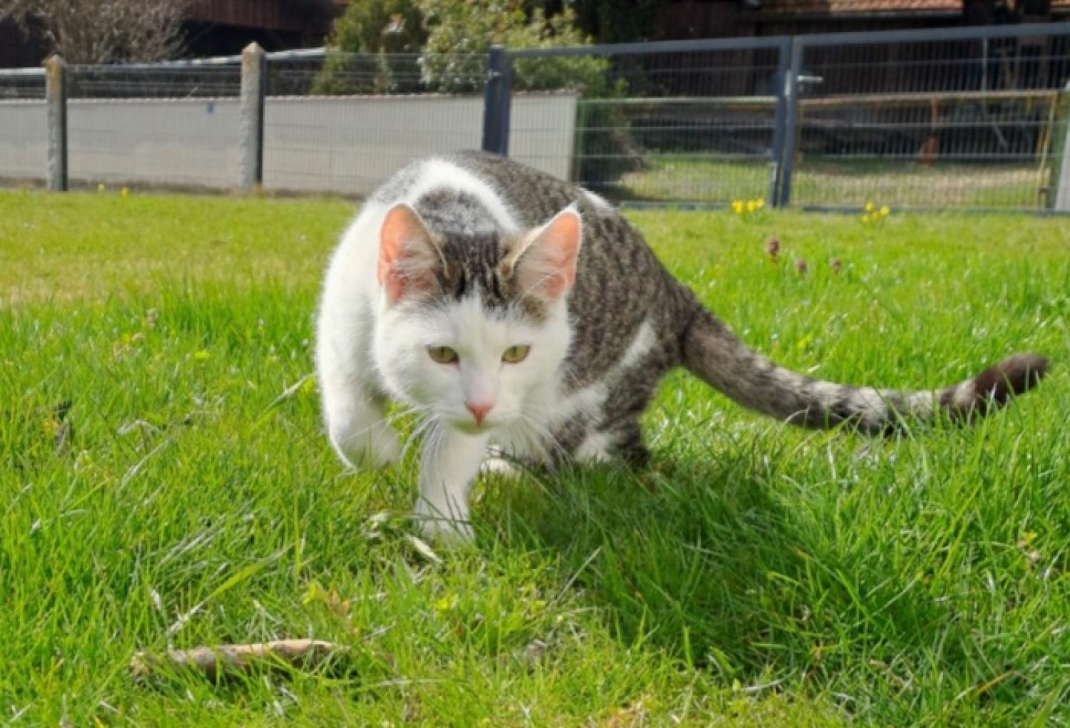 Mein Kater ist eher kleiner als ausgewachsene Katzen, er ist bisschen weiß, weiße Pfoten. Bisschen über 1 Jahr ist er. Hört auf Pfeifen. Normalerweise eher zutraulich.