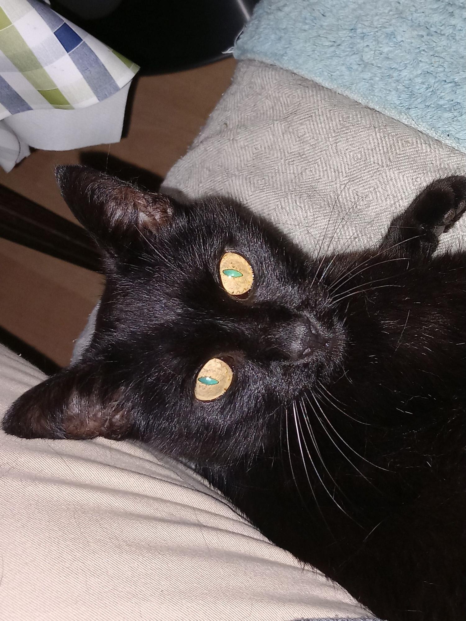 Besondere Kennzeichen: schwarzer kastrierter Kater, ein Eckzahn ist abgebrochen, Gaumenplatte schwarz, mehrere weiße Schnurrbarthaare, graues Zeckenhalsband, darunter am Hals eine kleine weiße Stelle