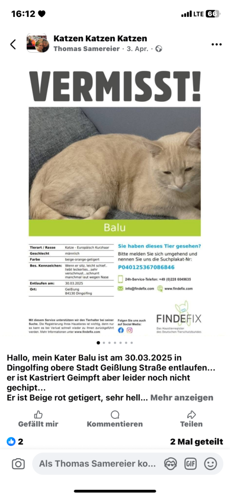 Er ist entlaufen in Dingolfing Geißlung 17 Straße, hoffe und bitte um jede Mithilfe und hoffe auf jede Unterstützung.. und sollte er schon aufgenommen worden sein bitte melden habe Papiere von meinen Balu und kann alles nachweisen MfG hier meine Nummer zwecks Infos : 01758059958 Ein sehr netter Familien Kater wird vermisst angeblich zuletzt gesichtet Nähe Bahnhof am Feld bei Ausfahrt von Dingolfing die Kreuzung