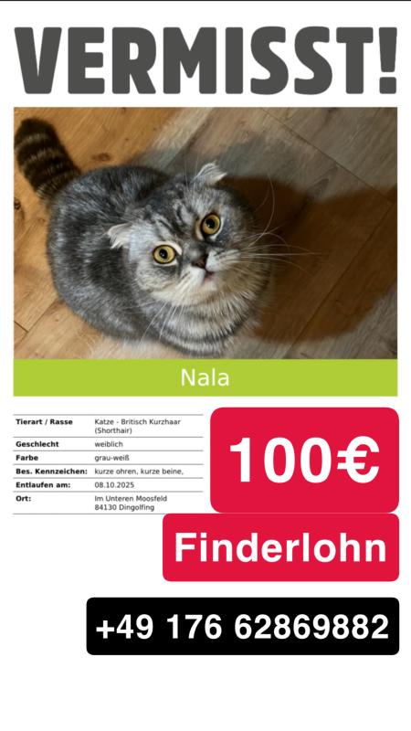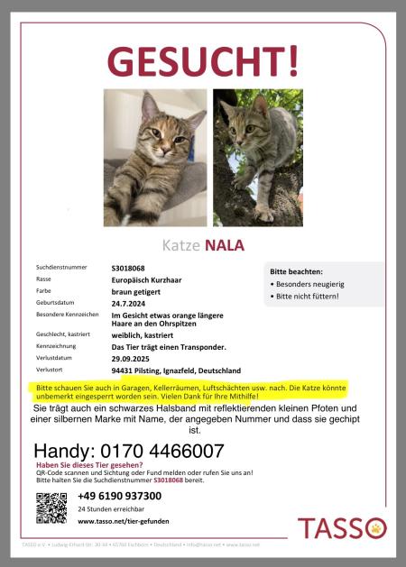 Nala ist gechipt. Sie wurde auch ein paar mal gesichtet, das letzte Mal allerdings am Freitag, den 03.10.25 um ca. 19:00 Uhr. Sie ist etwas verfressen und teils auch sehr neugierig. Bitte auch in Garagen, Kellern, Scheunen und Schupfen nachsehen! Vielen Dank!
